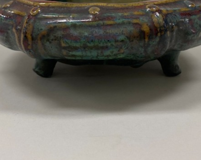 此炉以火烧釉陶器为材质,高 6 厘米,直径19.1 厘米。器物为三足造型,结合 “八卦” 元素推测,炉身可能装饰有八卦纹饰,体现道教文化元素。施钧釉,釉色可能呈现出窑变效果,色彩丰富且富有层次感,展现出石湾窑仿钧釉的工艺特色。作为香炉,兼具实用与陈设功能,造型古朴庄重,釉色与纹饰的搭配彰显出清代石湾窑陶瓷的独特风格。