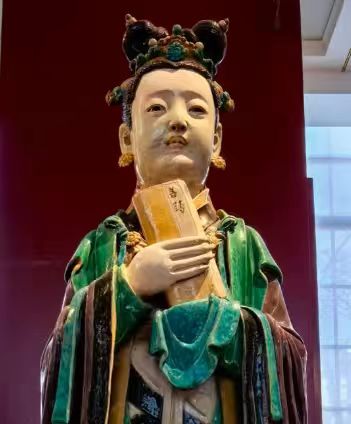 此尊三彩女判官像则属赏善司。身着绿袍,笑容可掬。赏善司执掌善薄,手里的卷宗记录人的善行。女判官高约1.48米。这尊明代地狱女判官像,以彩色琉璃塑造而成,像高148厘米,可能出自山西。女判官头戴精致头饰,面容神态严肃中带着庄重 。她身着色彩丰富且层次分明的长袍,衣袂飘飘,细节之处尽显明代琉璃工艺的精湛,例如衣褶线条流畅自然,富有动感。女判官双手持一细长的卷册,其上写有“善簿”二字 ,象征着她掌管记录世人善行的职责。