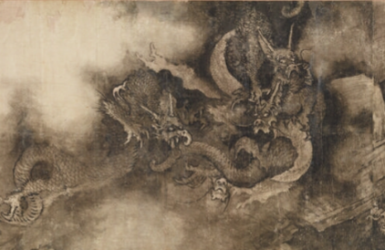 本品面积为 45.2×299.5,是陈容的经典之作。绘五条龙穿梭于山水云雾间,龙身矫健,或隐于云气、或腾于江海、或盘于山峦,与瀑布、山石、林木相融。 龙的形态各异,有的张牙舞爪,气势汹汹;有的含蓄内敛,伺机而动,展现出 “神龙见首不见尾” 的神秘,山水作为背景,烘托出龙的威严与奇幻。以水墨为主,运用 “泼墨成云,噀水成雾” 之法,墨色浓淡变化表现云气、水瀑的流动感。 绘龙时,线条刚劲灵动,勾勒龙身轮廓、鳞片纹理,兼用渲染,让龙的肌肤、鳞片有质感,体现陈容 “所翁龙” 独特的笔墨风格,将水墨写意与精细描绘结合,使龙鲜活如生。借龙的形象,营造出雄浑、神秘、奇幻的意境。龙在山水间腾挪,似能呼风唤雨, 传递出中国人对龙这一祥瑞神兽的敬畏与崇拜,也体现画家对天地造化、神力无穷的想象,观之如入仙境,感受水墨龙画的磅礴气势与艺术魅力,是中国龙题材绘画的巅峰之作。