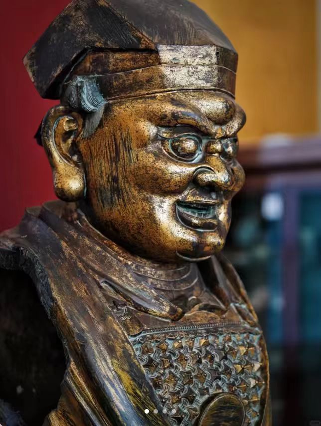 面部宽颧骨、细长眼裂的特征,这是一尊铜鎏金造像,从外观来看,有古朴的色泽与纹理,表面鎏金部分因岁月呈现斑驳痕迹,展现出历史厚重感。头戴帽饰,身着服饰有雕刻纹饰,工艺较为精细