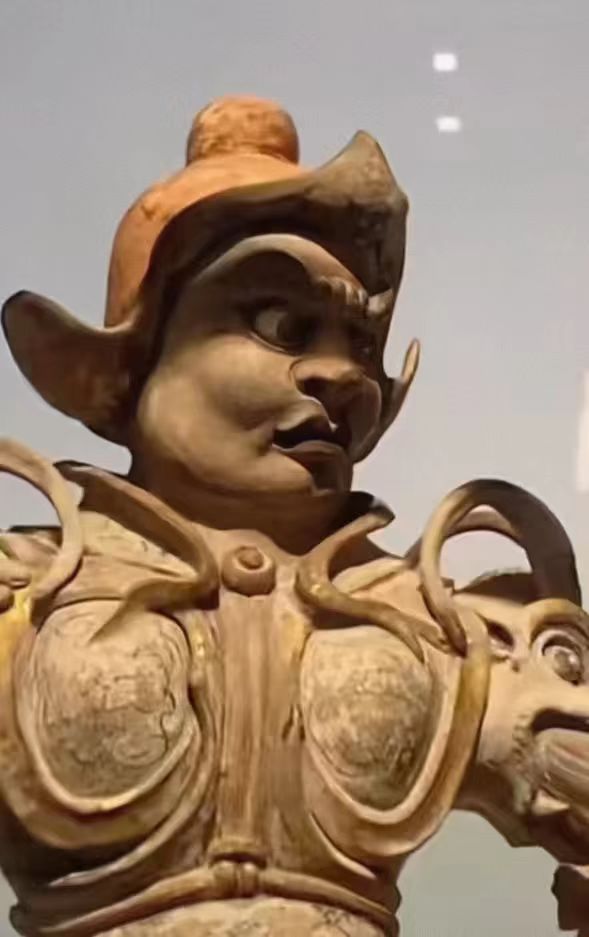 高112厘米,外表曾经镀金以及着色。- 姿态:这两尊天王俑均呈现出极具动感的姿态,单腿撑地,另一腿微抬,展现出一种蓄势待发的力量感,仿佛随时准备抵御邪祟,守护墓主安宁。