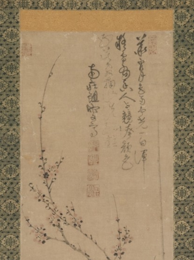 此为 14 世纪倪敬创作的《冬梅图》轴(整体),属立轴,采用纸本水墨淡彩绘制。图像尺寸为 106.5×24.8 厘米,整体连裱 192.4×35.9 厘米,带旋钮整体 192.4×40.5 厘米。倪敬(1416–1460),字汝敬,无锡人,明代官吏,活跃于 14 世纪晚期,此作现藏于美国大都会博物馆。画作以 “冬梅” 为主题,绘梅花绽放之景,紧密的淡色花朵与花蕾展现初开之态,笔墨简练却尽显梅之坚韧,延续了元代王冕画梅的笔法与意境。