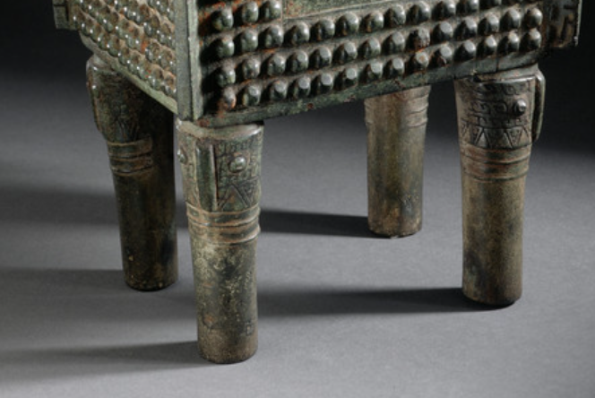 本品规格为22.5425 x 19.685 x 14.9225 厘米。遵循商代方鼎典型特征,长方形腹、立耳外撇、四柱足,器型庄重沉稳。作为礼器,用于祭祀(烹煮祭祀牲畜、盛放祭品 ),是商代 “国之大事,在祀与戎” 观念的实物体现,彰显等级与权力。