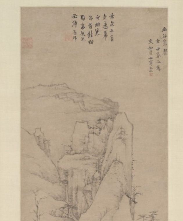 此为清代 1661 年仿弘仁风格的《幽谷泉声图》轴(整体),属立轴,以纸本水墨绘制。图像尺寸 102.9×41 厘米,整体连裱 194.3×55.9 厘米,整体带旋钮 194.3×62.2 厘米,原题为弘仁所作,实际为仿品,作品名 “孤谷春音”,现藏美国大都会博物馆。画面有画家题词及陈述题字,绘细长树木与棱角岩石,受倪瓒风格影响,凸显悬崖宏伟感。