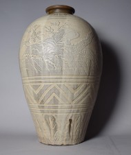 瓶高49.5厘米,卵圆形,短直颈,突唇,平底。浅黄色陶器采用厚厚的巧克力棕色釉料和透明中性釉,上面覆盖着一层不透明的灰色薄膜。该装饰品是通过切掉棕色纸片并留下轻微浮雕的设计而形成的。两侧是岩石和树木,还有两条龙在争辩着轻微的浮雕。两侧有岩石、树木和两条龙争云中的珍珠。上下有坚硬的叶子和人字形图案带,由朴素的环隔开。底座未上釉。