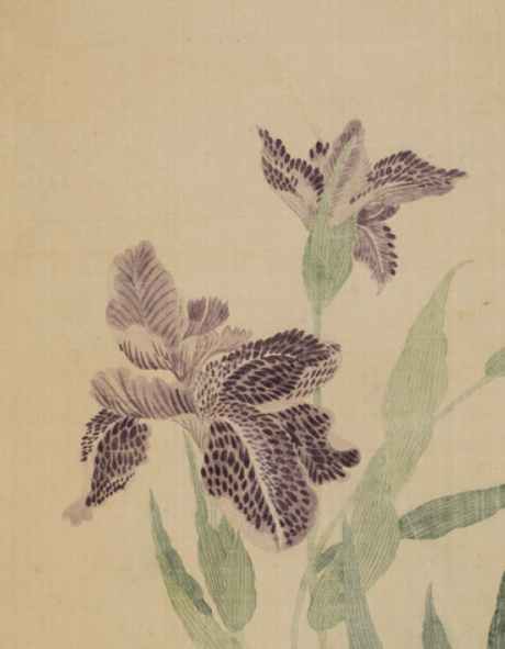 本品规格为29.21 x 23.81 厘米,安装41.28 x 35.56 厘米。以淡紫、深紫描绘鸢尾花,花瓣纹理用点染技法,细腻呈现脉络与层次, 两朵盛放、一朵待放,姿态自然,尽显鸢尾花的娇艳与灵动。翠绿叶片以流畅笔触勾勒,通过深浅变化表现光影与立体感, 叶脉清晰,与花朵呼应,营造出清新自然的植物生机。
