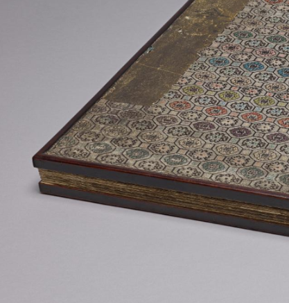 本品规格为44 x 35 厘米。方形盒体,规整厚重,天地盖结构,边框深色木质,沉稳古朴,与顶面彩锦形成 “硬软材质对比”。顶面以几何纹彩锦覆盖,由圆形、 菱形等图案重复排列,红、 蓝、 绿、 黄等色交织,虽历经岁月,仍显色彩层次与织锦细腻,是清代织锦工艺(或缂丝、 妆花缎 )的体现,暗合 “天圆地方” 传统审美。