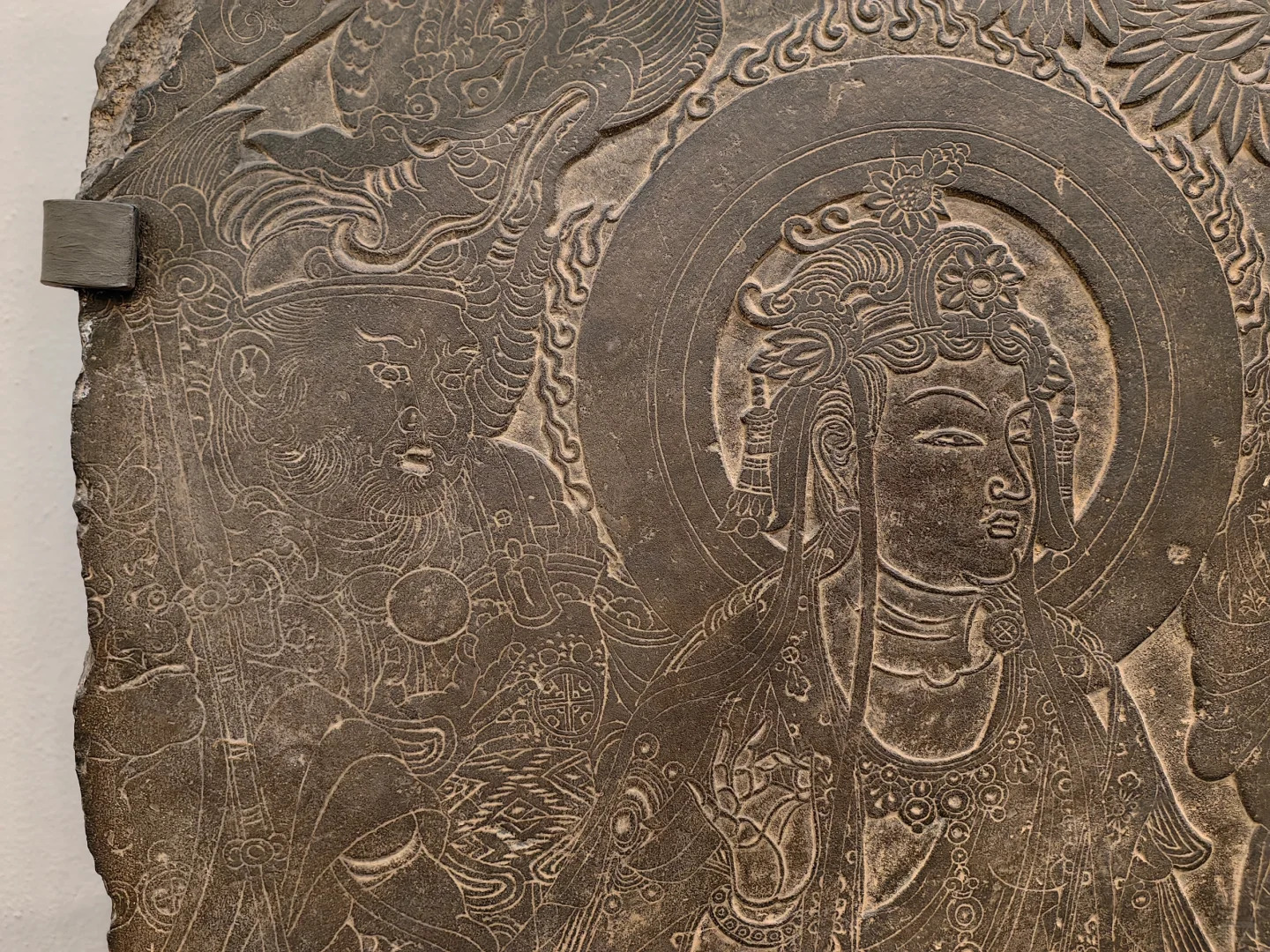 胁侍菩萨:佛像两侧雕刻有胁侍菩萨,菩萨头戴精美的宝冠,身姿婀娜,手持法器或莲花等,面容温婉,姿态虔诚。菩萨的服饰雕刻细致,飘带飞扬,增添了画面的动感与美感。