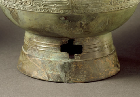 本品直径23.5厘米。整体为敞口,口沿外撇,颈部微束,鼓腹,圈足。圈足有十字形镂孔,既具装饰性,也体现商代青铜器工艺特点,造型庄重古朴,符合商代礼器风格,用于祭祀等礼仪活动 。