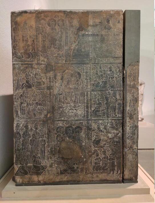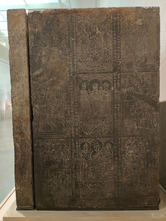 画面布局:石刻上雕刻有众多佛教故事和人物场景,采用了分格布局的方式,每个方格内刻画不同的情节,画面丰富且有序。