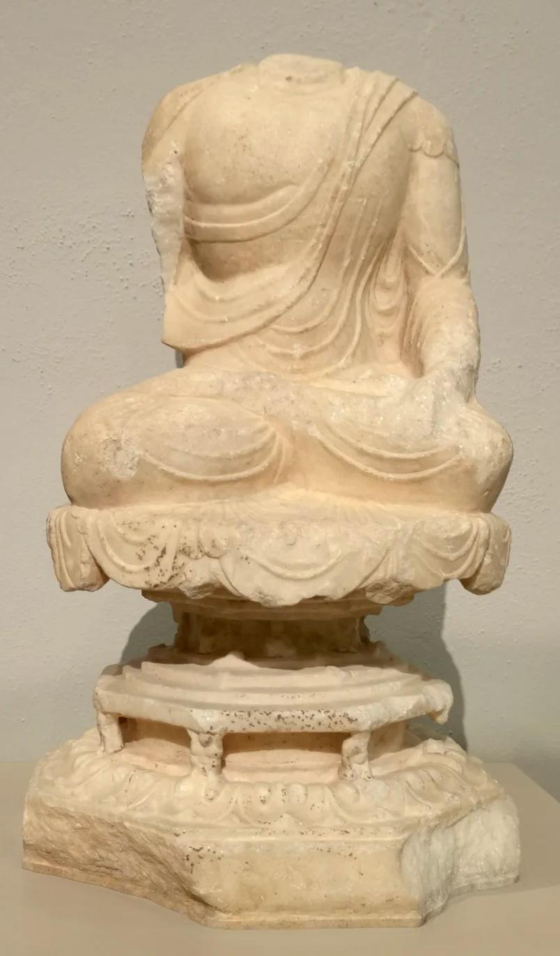 整体造型:仅存身体及基座部分,佛陀结跏趺坐的姿态依旧清晰。从残件仍能感受到其原本造型的大气与庄重。