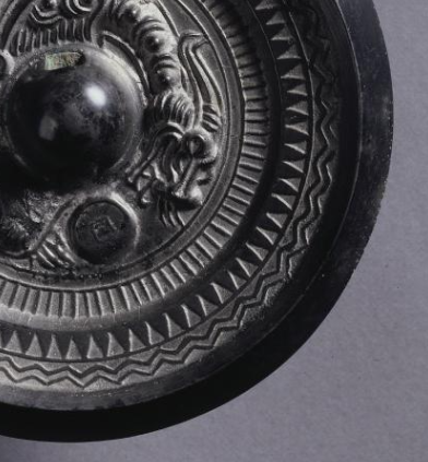 本品规格为直径9.9厘米,厚度1厘米。以镜钮为中心,主体纹饰为单龙纹。龙的造型生动,身体蜿蜒曲折,线条流畅且富有张力,龙的头部雕刻细致,龙眼、龙须、龙角等清晰可辨,展现出西晋时期工匠对龙这一神兽形象的独特理解和精湛的雕刻技艺 。龙纹周围环绕着几何形辅助纹饰,如锯齿纹、弦纹等,这些辅助纹饰与单龙纹相互映衬,丰富了镜背的图案层次,使整体布局更加规整、和谐,体现了西晋时期对对称美和装饰性的追求。