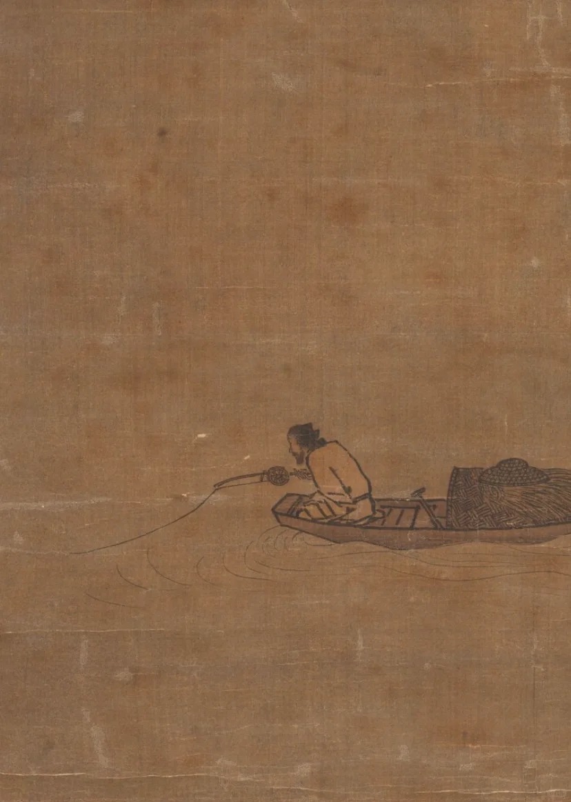 画面内容:画面构图极为简洁,主体是一位独自在寒江上垂钓的渔翁。他坐在一叶扁舟之上,身体微微前倾,专注地握着鱼竿,似乎在等待鱼儿上钩。舟上还放置着一些渔具和蓑衣,增添了生活气息。除了渔翁和小船,画面大部分留白,仅用寥寥数笔勾勒出江面的涟漪,却巧妙地营造出寒江空旷、寂静的氛围,给人以无限的遐想空间。