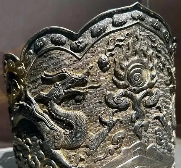 装饰细节:以双龙纹饰为主体装饰,两条龙雕刻得栩栩如生,龙身蜿蜒矫健,鳞片、爪子、须发等细节刻画入微,展现出龙的威严与动感。龙周围还装饰有云纹、火焰纹、海水纹等,营造出神秘而壮阔的氛围,体现了辽代工匠精湛的雕刻技艺和对龙图腾的崇拜。在冠的边缘和其他部位,还点缀有一些小型的装饰图案,如圆形的宝珠纹等,增加了器物的华丽感。银冠表面虽历经岁月,有一定的氧化痕迹,但仍能看出其工艺的精美和材质的优良。