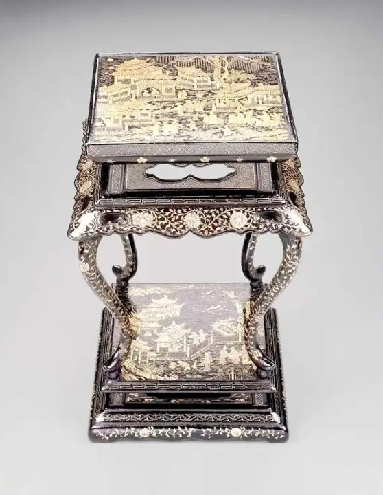 明代家具以简洁、素雅、线条优美著称,强调木材的天然纹理和质感。镶嵌工艺在明代家具制作中被广泛应用,珍珠母贝、玉石、象牙等材料常被用于镶嵌装饰,以增加家具的华丽感和艺术价值。这件镶嵌珍珠母贝的硬木漆器两层展台,不仅是实用的家具,更是明代高超手工艺的体现,反映了当时工匠们精湛的技艺和人们对高品质生活及艺术审美的追求,是研究明代家具史和工艺史的重要实物资料。