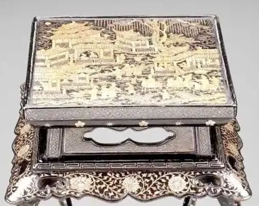 图案内容:台面上的珍珠母贝镶嵌图案可能描绘了山水、建筑、人物等场景,图案细节丰富,人物形态生动,建筑和山水的线条细腻,展现出高超的镶嵌技艺。框架部分的珍珠母贝镶嵌多为花纹装饰,与台面图案相互映衬,增添了展台的华丽感。此外,展台的边缘和支撑结构部分有精美的雕花装饰,雕刻线条流畅,造型优美,进一步提升了其艺术价值。