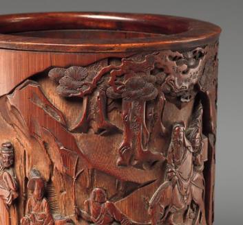 文人直接参与竹雕创作或定制:一方面,文人将自己的审美偏好(如对历史典故的喜爱、对 “清雅” 风格的追求)融入笔筒设计,要求工匠雕刻符合文人审美的题材与风格;另一方面,部分文人本身就是竹雕高手(如金农、郑板桥等),他们亲自操刀,将书法、绘画技巧融入雕刻,使竹雕从 “工匠技艺” 升华为 “文人艺术”,推动了人物故事题材的流行(相比花鸟、山水,人物故事更能承载文化寓意)。