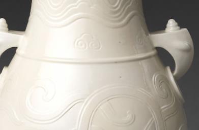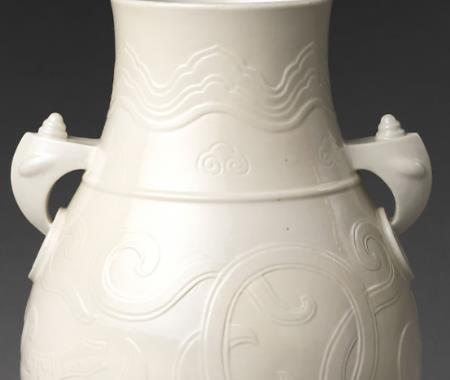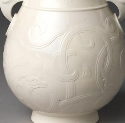 该尊高 20 厘米,口径 7.6 厘米,足径 7.8 厘米。其造型为侈口,短颈,斜肩,鼓腹,圈足。颈部两侧对称置鸠形耳,肩部凸起弦纹一道。通体施白釉,以印花装饰,颈部饰波折纹和如意头纹,腹部凸雕蟠螭纹,外底白釉下刻 “大清乾隆年制” 六字三行篆书款。