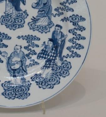 御窑厂受朝廷直接管控,不计成本改进工艺(如青花料提纯、分水皴技术),生产的八仙纹盘(多为宫廷赏赐或祭祀用)工艺精湛,成为民窑模仿的范本;清代商品经济繁荣,民间对日用陶瓷的需求激增,“八仙” 作为大众熟知的题材,兼具观赏性与吉祥寓意,成为民窑青花盘的主流纹饰之一,产量大、流传广(目前存世的清代八仙纹盘以民窑器为主,官窑器较少)。