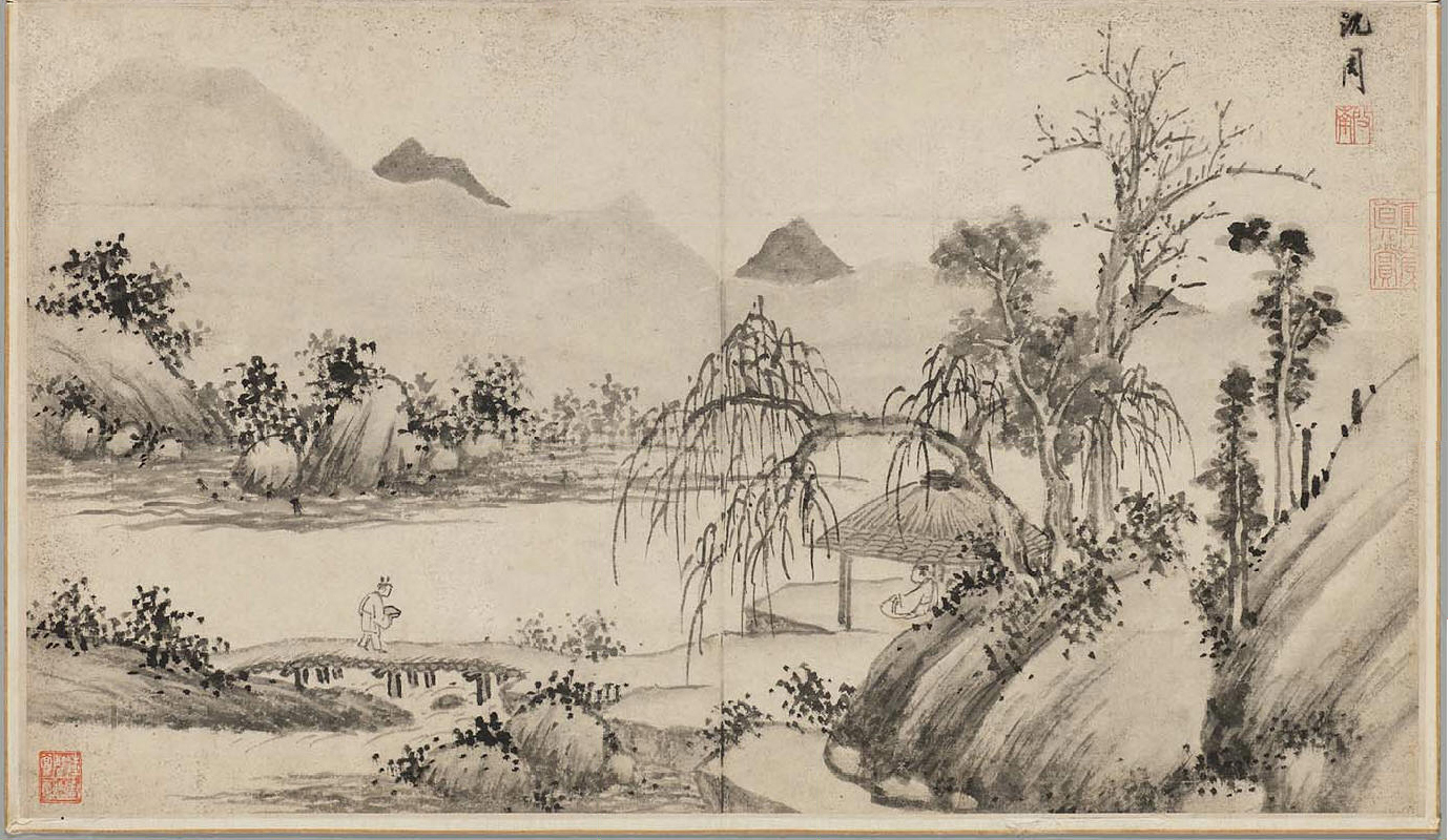 绘画部分:采用传统的中国山水画技法,以水墨为主,略施淡彩。画面展现了一幅宁静悠远的山水景致,远处山峦连绵,以淡墨渲染出朦胧的层次感;近处树木葱郁,形态各异,有的枝干虬曲,有的枝叶繁茂。还有人物在山间小道上行走,或是于茅亭中休憩,增添了画面的生活气息。画中溪水潺潺,小桥横卧,体现出沈周对自然细致入微的观察和生动的表现力。
