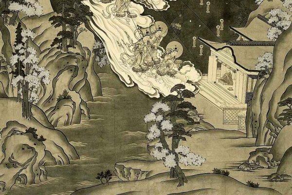 背景描绘:背景中的山川树木描绘细致,树木或苍松挺立,或繁花盛开,山石则以皴法表现出质感。建筑部分刻画工整,展现出传统中式建筑的风格特点,可能是寺庙或修行的场所,暗示着信徒在此修行等待佛的接引。天空部分以深色为主,衬托出阿弥陀佛及菩萨们的光辉,营造出神秘而神圣的氛围。