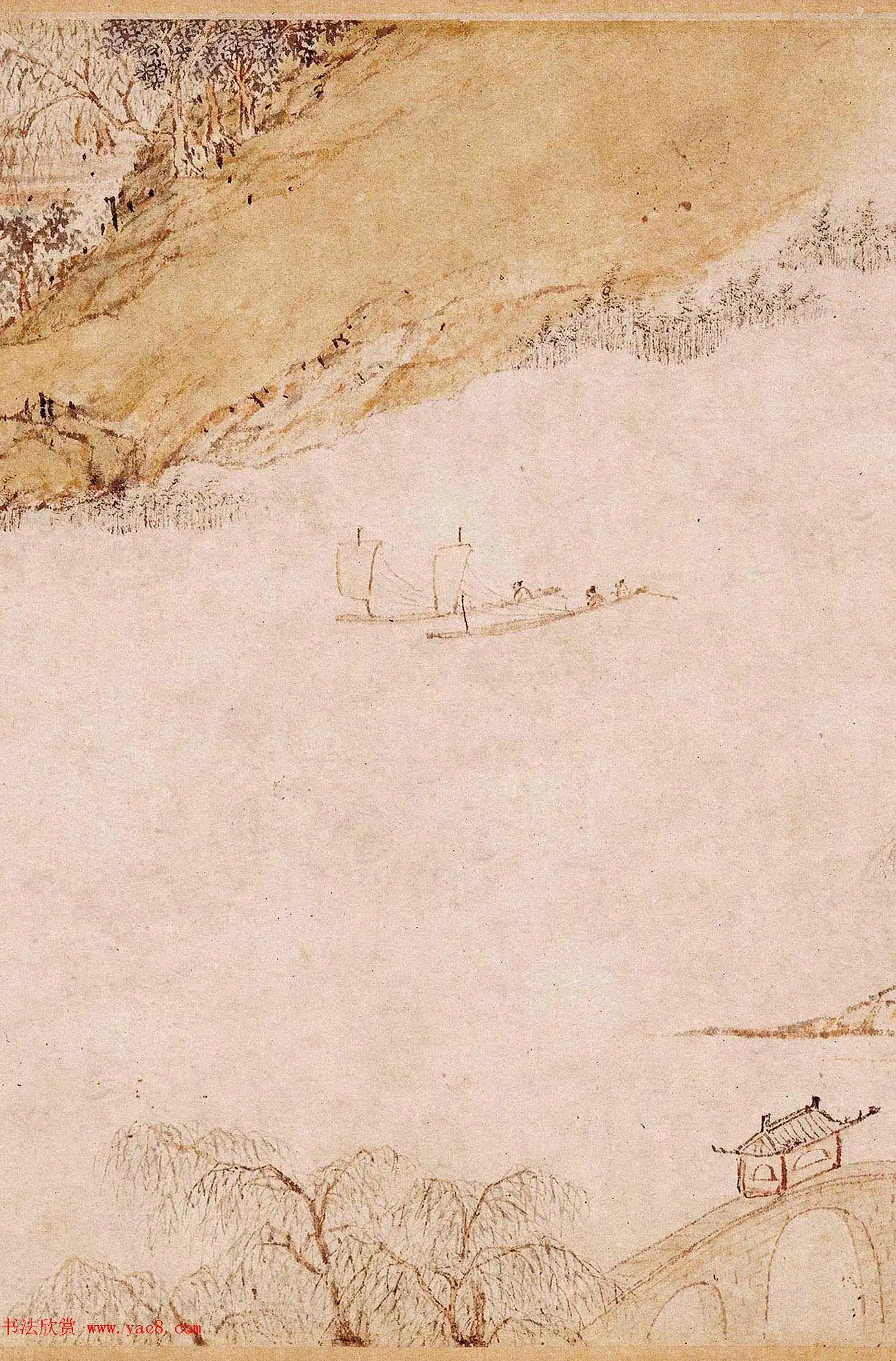 笔墨技法:陆治用笔细腻,线条流畅而富有变化,勾勒山石、树木、房舍等轮廓时,尽显功力。墨色运用上,浓淡相宜,通过墨色的深浅变化来表现景物的远近和立体感。设色淡雅,以浅绛色调为主,间或有绿色、赭石色等,营造出清新雅致的氛围,凸显出江南水乡的灵秀之美。