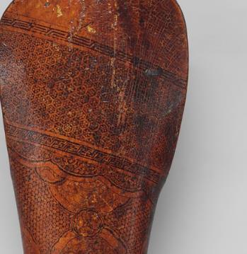元代甲胄种类繁多,形制多样,前期以仿金宋为主,后期随着蒙古对外扩张,其甲胄融合了西方元素,带有中亚与西亚的风格。皮质金彩花卉纹臂甲可能是在这种文化融合的背景下产生的,既保留了皮革材质等传统元素,又运用了金彩工艺增添华丽感。