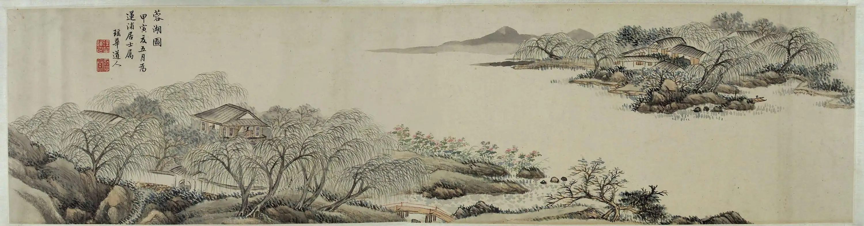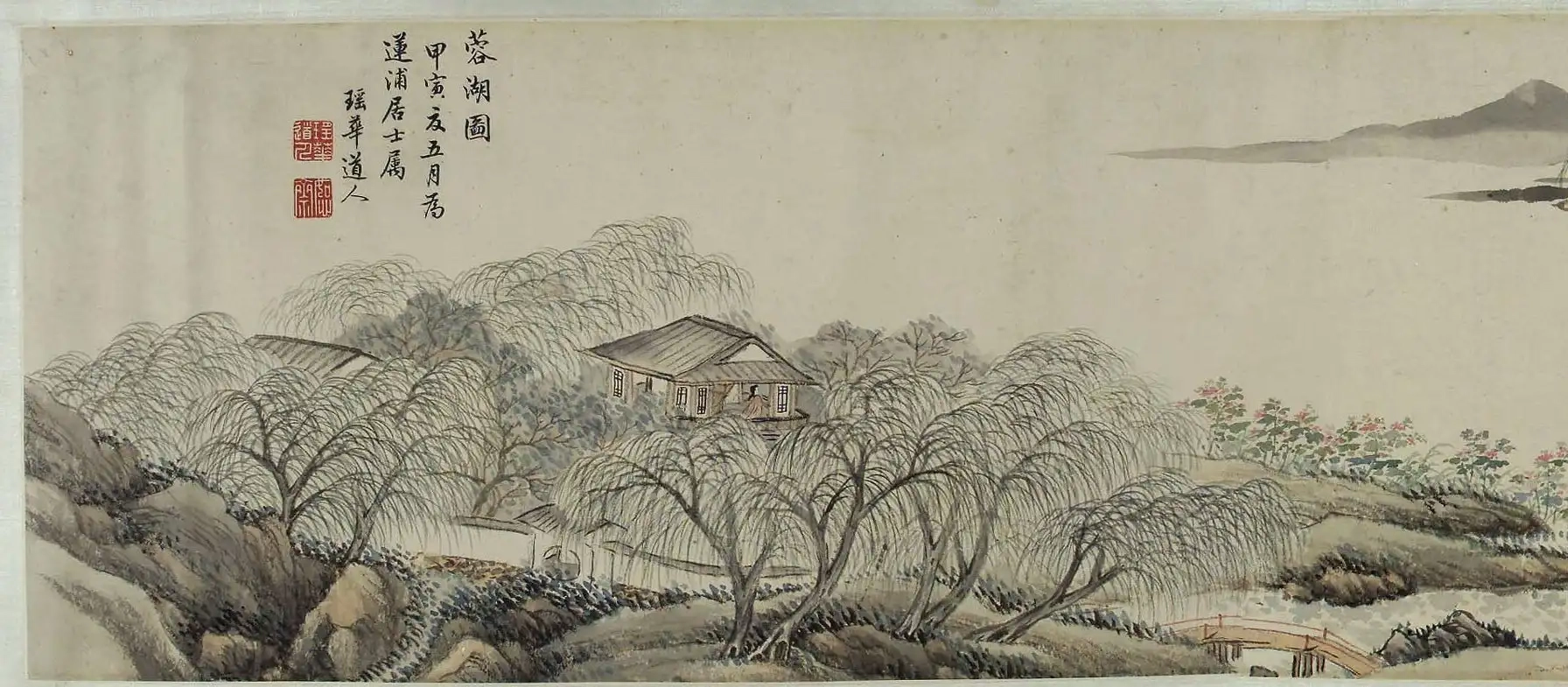 画面内容:画卷左侧描绘了葱郁的树木,尤其是柳树,柳枝低垂摇曳,尽显婀娜之态。树木掩映下,有几座古朴的房舍,或为居民居所,或为文人雅舍,房舍周围点缀着些许花卉,增添了生活气息。近景处,可见一条蜿蜒的小径和一座小桥,暗示着有人往来活动。画面中部是开阔的湖面,湖面平静,偶有波纹,体现出蓉湖的静谧之美。湖中有一叶扁舟,舟上或许有人悠然观景或劳作。画卷右侧远处山峦起伏,以淡墨渲染,表现出山的悠远朦胧之态,与近处的湖景相互呼应,丰富了画面的层次感。