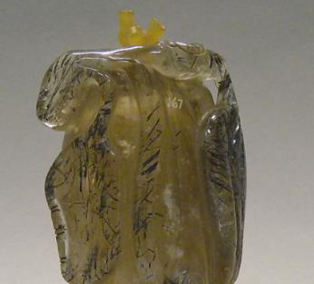 此鼻烟壶以水晶为基底,水晶质地纯净,澄澈透明,仿若一汪清泉,能清晰映透周遭事物,展现出天然矿物的灵秀之美。尤为独特的是,其中融入发晶元素。发晶内的发丝状矿物,或纤细如丝,或稍显粗粝,它们自然地分布于水晶之中,仿若灵动的精灵在水晶的世界里穿梭。这些发丝矿物在光线下,折射出璀璨的光芒,与水晶本身的晶莹剔透相互辉映,为鼻烟壶增添了神秘而迷人的色彩。在不同角度的光线照射下,发晶的色泽和纹理会呈现出奇妙的变化,时而如金色的丝线交织,时而似星光在水晶中闪烁,让每一次观赏都有新的发现与惊喜。