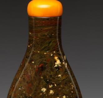 乾隆皇帝本人嗜鼻烟,不仅收藏各类鼻烟壶,还下令宫廷造办处设立 “鼻烟壶作”,专门制作御用鼻烟壶,同时将鼻烟与鼻烟壶作为 “赏赐品”,赐予王公大臣、外国使节(如朝鲜、越南、欧洲使团),推动了鼻烟壶的 “身份象征” 属性;宫廷造办处汇集了全国顶尖的玉雕匠、漆匠、镶嵌匠,这些工匠跨界参与琥珀鼻烟壶制作,将玉雕的 “俏色工艺”、漆艺的 “描金工艺” 融入其中,突破了传统琥珀加工的局限;