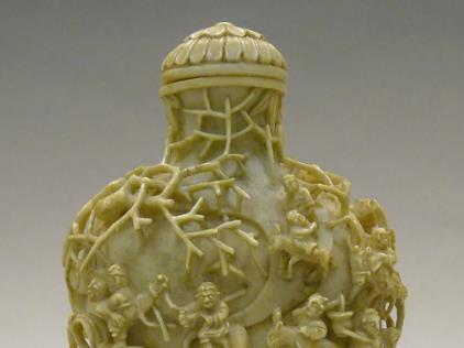 清代象牙雕突破了前代的简单纹饰,形成 “精雕细刻、层次丰富” 的风格,可细分为 “圆雕、浮雕、透雕、微雕” 等技法。用于鼻烟壶时,工匠能在极小的象牙壶体上(尤其是壶身、壶盖)雕刻出 “八仙人物” 的细腻神态(如吕洞宾的拂尘、铁拐李的葫芦、何仙姑的莲花),甚至衣纹褶皱、面部表情都清晰可辨,体现了 “以小见大、精微入妙” 的工艺追求。