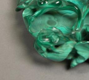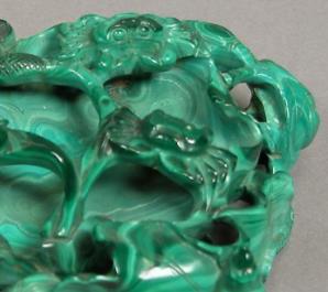 笔舔主体采用天然孔雀石雕琢而成。孔雀石作为一种含铜碳酸盐矿物,其典型特征是呈现深浅交错的翠绿至艳绿色条纹,纹理如流水、云雾般自然蜿蜒,且每件原料的纹路均独一无二 —— 清代工匠在选材时尤为注重保留这种 “天然肌理”,使笔舔的底色自带 “活色生香” 的视觉效果,无需额外施色便尽显华贵。此外,优质孔雀石质地致密细腻,硬度适中(莫氏硬度 3.5-4),既便于精细雕刻,又能在使用时温和承接墨汁,避免损伤毛笔毫毛,兼具 “颜值” 与实用性。