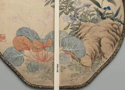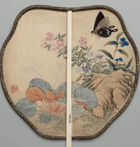清代绘画艺术繁荣,花鸟画更是取得了很高的成就,画家们常将花鸟、草虫等题材绘制于扇面之上,使团扇成为绘画艺术的一种载体。这件花卉蝴蝶湖石纹异形团扇反映了清代的审美风尚、工艺水平以及绘画艺术对工艺品的影响,是研究清代文化艺术和社会生活的重要实物资料。