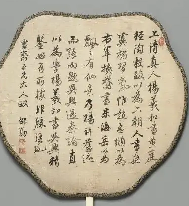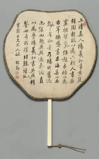 在这样的文化背景下,书法成为文人雅士之间重要的交流方式和艺术表现形式。团扇作为一种传统的文化载体,常被用来展示书法作品,无论是宫廷还是民间,都有在团扇上题字作画的风气。文人墨客们通过在团扇上书写诗词、文章或对艺术的见解,不仅展现了自己的书法技艺,也传递了文化内涵和审美情趣,这件书法异形团扇正是清代书法艺术与传统工艺品结合的产物,反映了当时的文化艺术氛围和社会风尚。