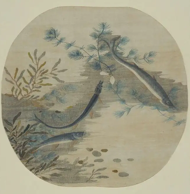 绘画技法:运用细腻的线条勾勒鱼和水草的轮廓,线条流畅且富有变化,展现出画家扎实的功底。墨色和色彩的运用上,浓淡相宜,通过色彩的深浅变化表现出物体的立体感和空间感。例如,用淡色表现远处的水草和石头,用相对浓重的色彩描绘近处的鱼,使画面层次分明。因年代久远,绢本呈现出自然的陈旧色泽,有轻微的磨损和褪色痕迹,但画面的笔墨神韵依然较为清晰。