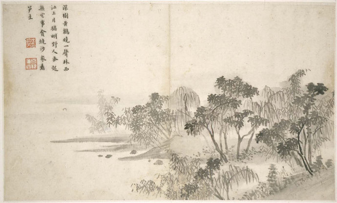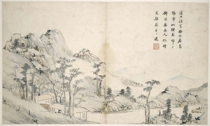 笔墨技法:李流芳的笔墨技法娴熟,用笔简洁流畅,线条富有变化,勾勒山石、树木轮廓时尽显功力。墨色运用上,浓淡相宜,通过墨色的深浅变化营造出远近、虚实的空间效果。比如,用淡墨描绘远处的山峦和云雾,用浓墨刻画近处的树木和房舍,使画面层次分明。画风兼具文人画的笔墨情趣和对自然景致的生动描绘,既有细腻的写实,又有写意的洒脱,展现出独特的艺术风格。