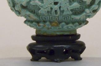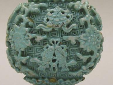 此鼻烟壶以高品质绿松石为原料,整体色泽呈均匀的天蓝色或苹果绿色(乾隆时期偏好色泽浓郁、质地致密的绿松石,多产自湖北郧阳或西域地区),无明显绺裂或杂质。绿松石在清代被视为 “吉祥之石”,其温润的质感与天然的色彩,既符合传统玉石审美中 “以色为贵” 的标准,又因绿松石在佛教文化中象征 “佛法的纯净与永恒”,与 “佛家八宝” 主题形成材质与内涵的呼应。