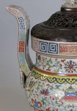 腹部以粉彩绘缠枝莲托八宝纹,八宝纹由法螺、法轮、宝伞、白盖、莲花、宝瓶、金鱼、盘长八种佛教法物构成,寓意吉祥。口沿、双耳两侧、足底部常饰回纹,颈、耳、足部饰缠枝莲纹等,部分器物的口沿、颈部、底部所有纹饰均描金,纹饰繁缛而华丽。