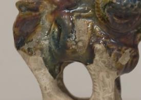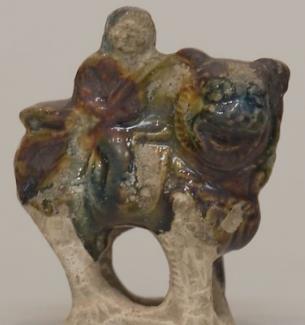 狮子在中国传统文化中象征威严与力量,骑狮俑寓意驾驭权威或掌控局势的能力。这种题材的选择反映了当时人们对权力和地位的追求,同时也体现了唐代与丝绸之路沿线国家频繁交流,胡汉文化融合的特点。其艺术风格独特,造型生动逼真,色彩丰富绚丽,将写实与夸张相结合,既注重细节刻画,如狮子的毛发、骑乘者服饰的褶皱等,又具有强烈的艺术感染力,展现了唐代工匠高超的艺术水平,是研究唐代社会生活、艺术审美和对外交流的重要实物资料。