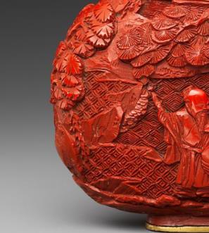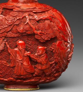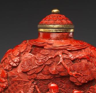 剔红是一种传统的漆器工艺,需在木胎或金属胎上层层涂漆,待干后再雕刻出图案。清代剔红人物鼻烟壶通常要髹数十至百余层厚漆,然后运用深浮雕、浅浮雕、镂雕等技法,雕刻出人物形象及相关场景,使图案层次分明,立体感强。