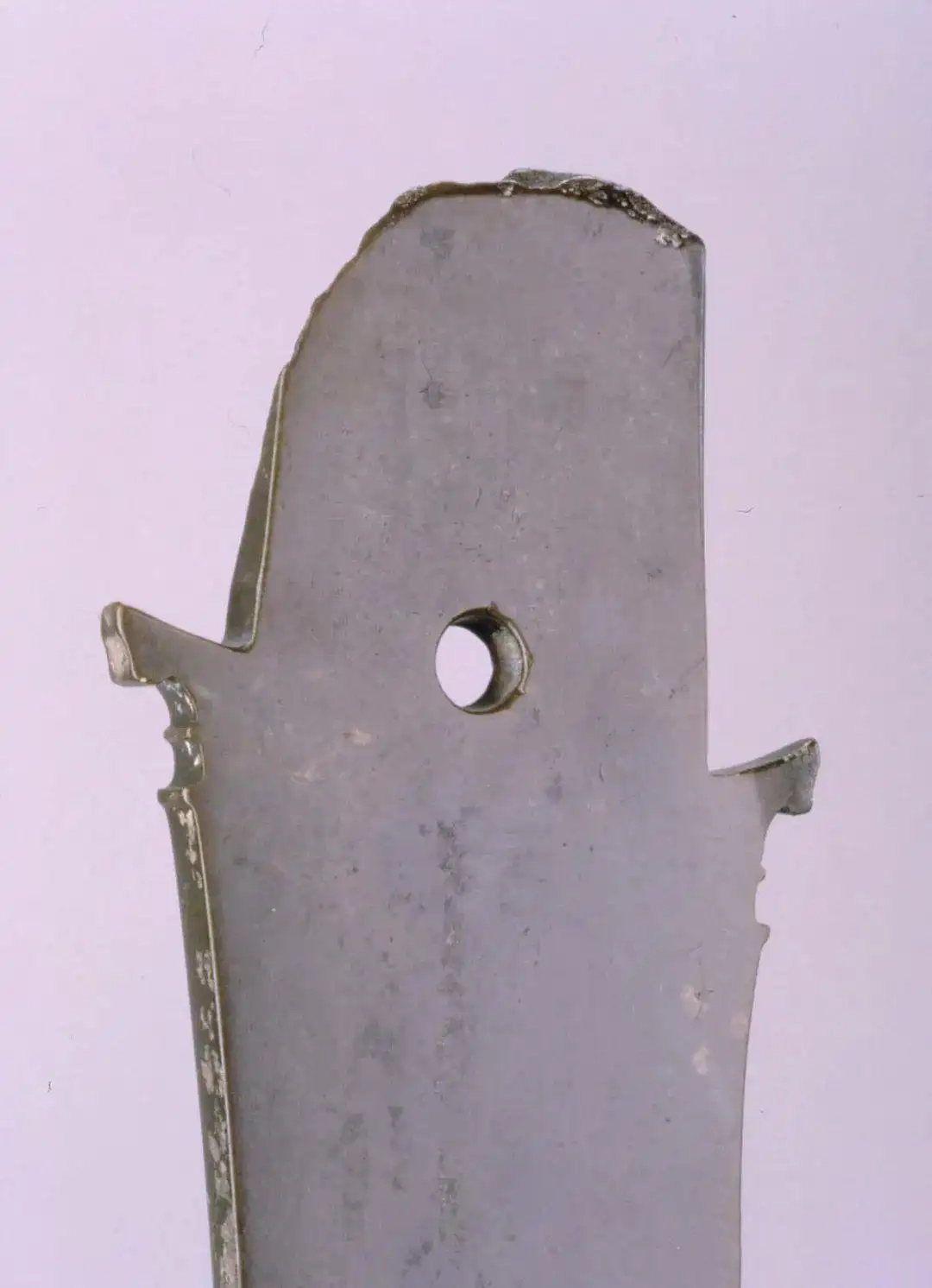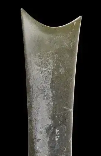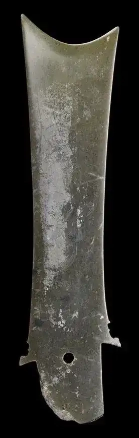 工艺细节:玉璋制作工艺较为规整,切割面相对平整,边缘打磨光滑。阑部的造型虽简单,但突出部分线条利落,穿孔圆润,显示出当时一定的玉器加工水平。不过由于年代太过久远,可能存在一些细微的缺损和磨损痕迹,但主体形态保存相对完好。