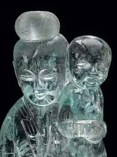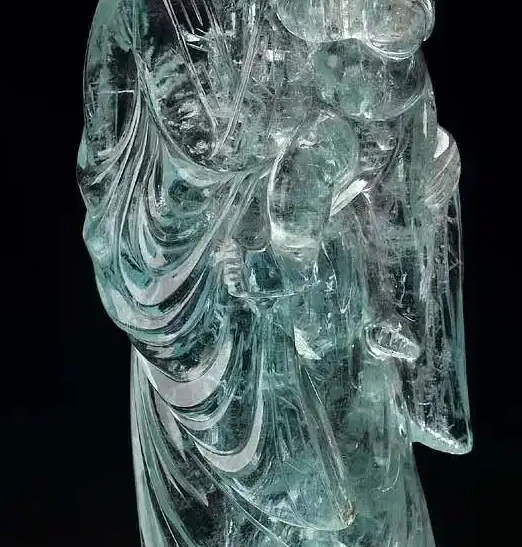 清代的玉石雕刻、宝石雕刻工艺达到了很高的水平,工匠们能够熟练运用各种材质进行创作,并且在雕刻技法上不断创新。海蓝宝石雕送子观音像这类作品,既体现了当时人们对观音信仰的虔诚,也展示了清代在宝石雕刻工艺上的精湛技艺,反映了当时的社会文化风貌和审美观念,是研究清代宗教文化、工艺美术的重要实物资料。
