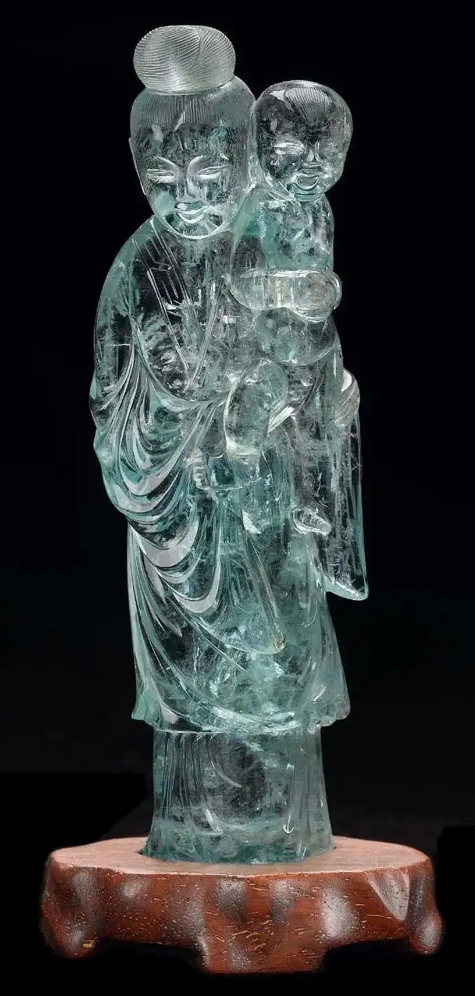 整体造型:观音像为立体圆雕,观音身姿优雅,呈站立姿态,怀中抱着孩童,整体造型富有动感与温情。观音像底部配有木质底座,底座造型古朴,与海蓝宝石的晶莹剔透形成对比,起到很好的衬托作用。