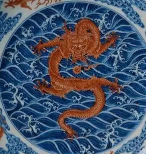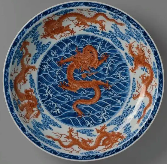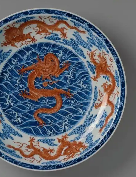 青花矾红海水龙纹盘