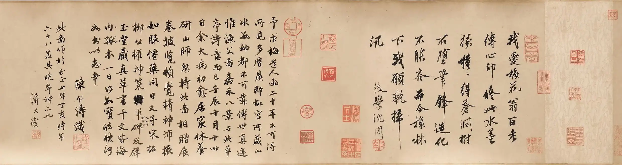 钤印:画卷上钤有众多印鉴,包括吴镇的自用印以及历代收藏者的鉴藏印,这些印鉴是鉴定作品真伪和研究其流传轨迹的重要依据。