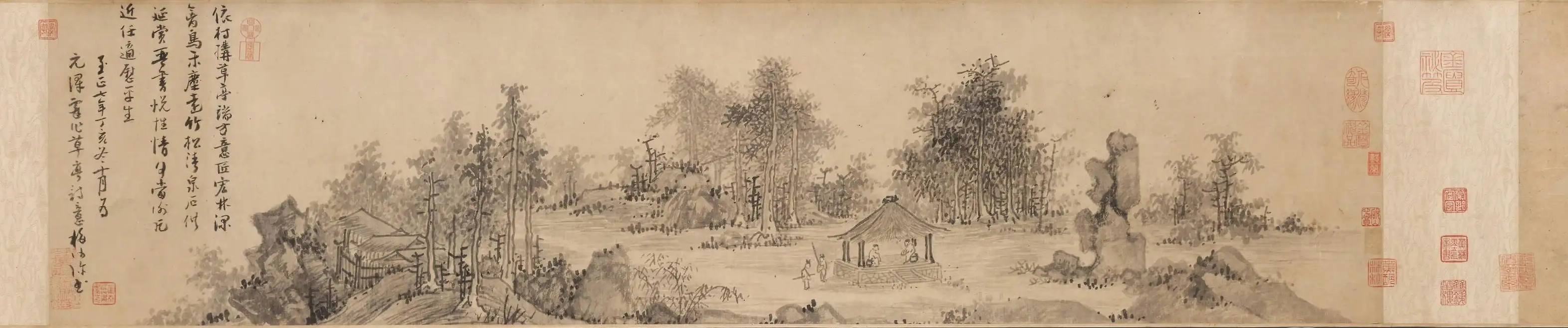 画面内容:画卷以长卷形式展现,描绘了宁静优美的山水田园景致。画面中,树木葱郁,姿态各异,有的树木枝叶繁茂,有的则枝干挺拔,展现出不同树木的形态特征。林间有一座草亭,草亭古朴雅致,周围点缀着山石,增添了几分自然野趣。亭中或亭边隐约可见人物活动,给画面增添了生活气息。远处,山峦连绵起伏,在云雾中若隐若现,营造出悠远深邃的意境。画面还描绘了溪流、坡岸等元素,使整个场景更加丰富生动,展现出一派清幽闲适的田园风光。