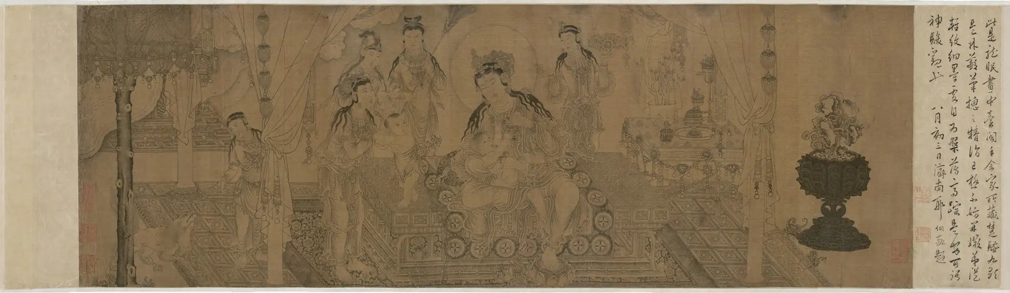 在绘画方面,元代文人画蓬勃发展,人物画在继承前代传统的基础上也有所创新。王振鹏以擅长人物画和界画著称,他的作品多以宫廷生活、宗教故事等为题材,具有较高的艺术水准。佛教在元代得到统治者的推崇,佛教文化盛行,佛教题材的绘画作品大量涌现,这些作品不仅是宗教传播的载体,也反映了当时社会的宗教信仰、审美观念和文化艺术水平。《姨母育佛图卷》正是在这样的历史文化背景下创作出来的,是研究元代绘画艺术和佛教文化的重要实物资料。