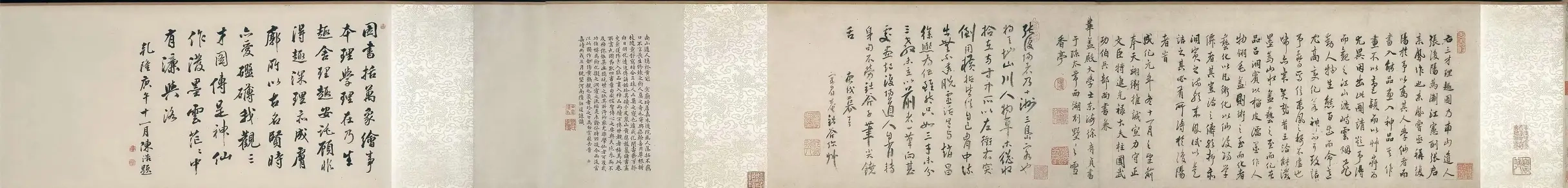 钤印:画卷上钤有诸多印鉴,包括作者自用印以及历代收藏者的鉴藏印,这些印鉴是鉴定作品真伪和研究其流传轨迹的重要依据。