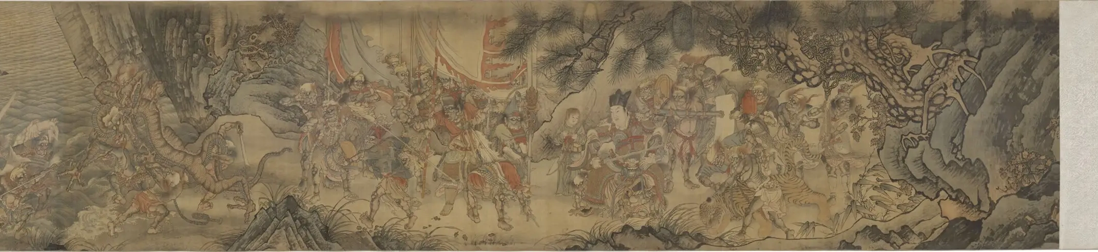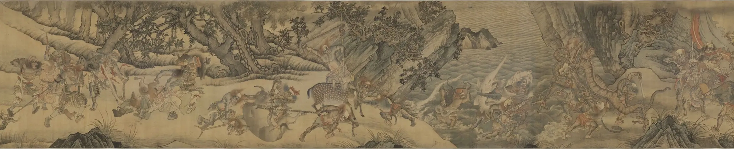 画面内容:画卷描绘了一个充满奇幻色彩的搜山场景。众多形态各异的神怪和搜山的神兵神将构成了画面的主要元素。神将们威风凛凛,有的骑着猛兽,有的手持兵器,神情严肃,气势汹汹,展现出强大的力量和威严。神怪们则姿态扭曲,面露惊恐或反抗之色,有的长着兽耳、兽尾,有的面目狰狞,形象夸张怪诞 。背景中有山林、岩石、溪流等自然景观,山林树木繁茂,岩石嶙峋,增强了画面的真实感和紧张氛围。整个画面人物众多,情节丰富,充满了动感和戏剧性。