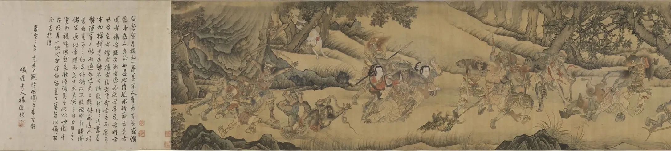 题跋与钤印:画卷左侧有题跋,内容可能涉及对画作内容的解读、创作背景等信息。同时,画卷上还钤有一些收藏印鉴,这些印鉴为研究画作的流传过程提供了线索。